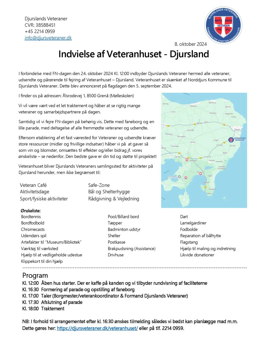 Djurslands Veteraner har fået et nyt veteranhus, og i den anledning indbyder de til indvielse, og samtidig forespørger de om hjælp til at etablere sig – se vedhæftede fil Skulle nogen have lyst til at give en hjælpende hånd – eller et andet bidrag – så mød op i veteranhuset på FN-dagen 24. oktober kl. 12.00.