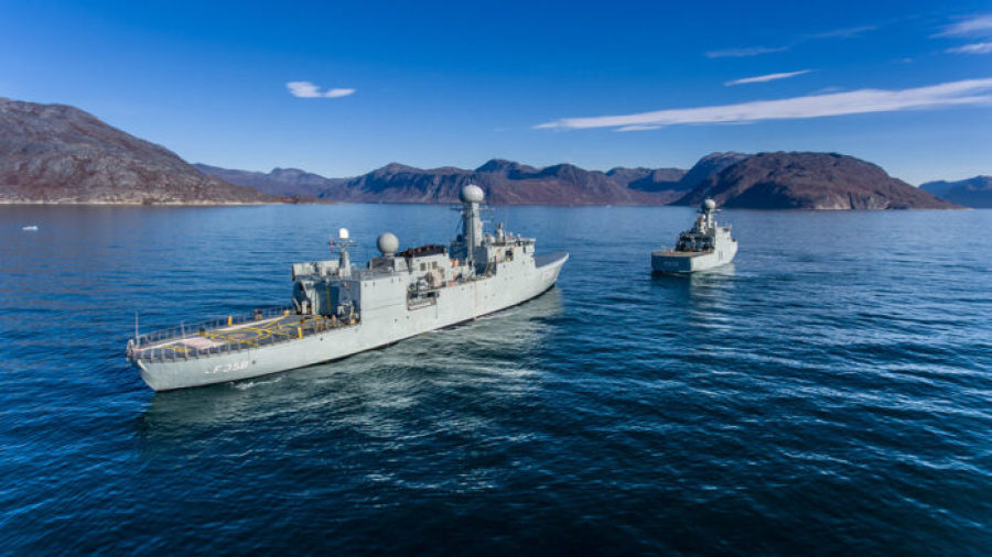 Inspektionsskibet "Triton" (forrest i billedet) og inspektionsfartøjet "Lauge Koch" på slæbeøvelse i Sydgrønland. Arkivfoto: Brian Djurslev/Forsvarsgalleriet